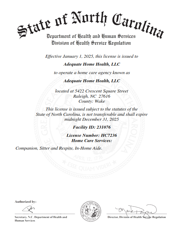 Adequate Home Health LLC is fully licensed by the State of North Carolina Department of Health and Human Services to provide professional home health and personal care services across the state.